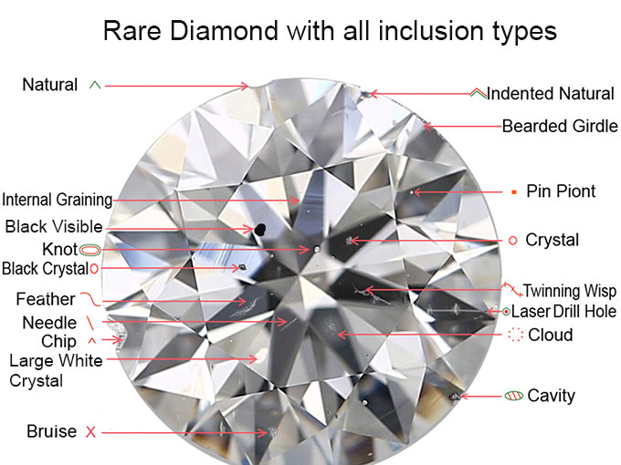 Le inclusioni naturali sono segni che si sono formati nel diamante in profonditร  nella terra, sotto un’enorme pressione e alta temperatura.ย La maggior parte di loro non sono visibili nei gradi di purezza Si2 e superiori.ย Le imperfezioni da evitare sono grandi cristalli neri e nuvole.ย Altri punti meno evidenti sarebbero Naturale, Pin Point, Indented Natural, Twinning Wisp, Cavity, Needle, piuma, grana interna e cristalli bianchi.