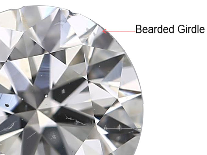 Le cinture barbute sono un segno di scarsa lucidatura del diamante.ย Il tagliatore di diamanti stava probabilmente correndo e spingendo il diamante troppo forte sulla ruota mentre il diamante veniva bruciato (arrotondato).ย Le cinture barbute possono influenzare la valutazione complessiva della lucidatura della pietra.ย Ottengono un punteggio di 6/10.