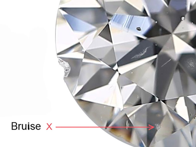 Alcuni diamanti di seconda mano potrebbero essere stati colpiti molto duramente da chi li indossa mentre erano sull’anello.ย L’impatto potrebbe aver causato un livido.ย Allo stesso modo, se picchietti leggermente sul vetro spesso con un martello potresti vedere come si forma un livido.ย I lividi non sono cosรฌ facilmente visibili, ma indicano che il diamante รจ di seconda mano.ย Ottengono un punteggio di 4/10.