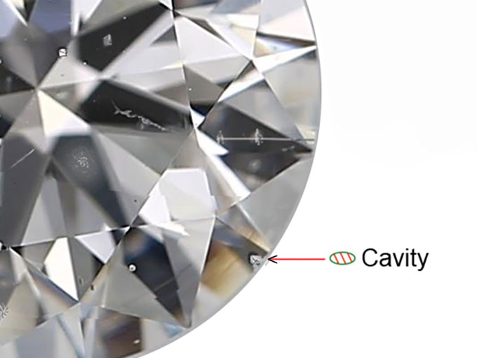 Il nome cavity dice tutto.ย Le imperfezioni della cavitร  aprono la superficie della gemma.ย Si trovano principalmente sulla cintura e possono accumulare polvere nel tempo rendendoli piรน visibili.ย Se ciรฒ accade, il diamante puรฒ essere pulito quando viene portato in un gioielliere per lucidare il tuo anello di fidanzamento.