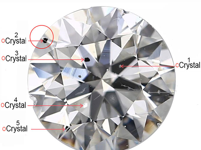 I cristalli bianchi sono difficili da individuare, mentre i cristalli neri sono facilmente visibili.ย La dimensione dell’inclusione determina quanto sarร  visibile in una pietra SI1 e SI2.ย Un cristallo nero al centro della pietra sarร  visibile nei diamanti Si2 superiori a 0,7 ct.