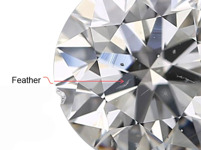 Le piume sono inclusioni bianche che assomigliano a una piuma in apparenza.ย Sono molto difficili da vedere a causa del loro colore e delle dimensioni sottili.ย I diamanti classificati Si2 con piume sono perfettamente accettabili.ย Le piume sono classificate 7/10.
