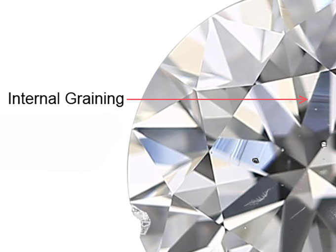 La grana interna รจ una delle inclusioni meno problematiche da trovare in un diamante.ย Di solito non รจ visibile all’occhio umano poichรฉ le linee parallele sono cosรฌ piccole.ย La grana interna รจ correlata alle linee di crescita del diamante grezzo e spesso porta le stesse geometrie e angoli del cristallo di diamante originale.ย La grana interna ottiene un punteggio elevato di 9/10.