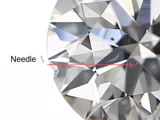 Gli aghi sono linee molto sottili nel diamante.ย Sono cosรฌ sottili che di solito รจ impossibile vederli con l’occhio umano.ย Sotto ingrandimento sono per lo piรน bianchi.ย Gli aghi sono spesso inclusioni non terribili e ottengono un punteggio per la chiarezza del diamante di 7/10.