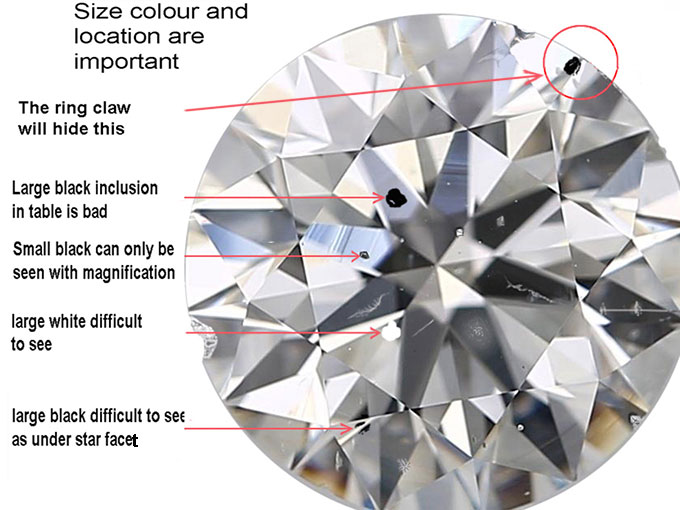 La posizione delle inclusioni, rispetto alla forma del diamante, determina quanto sono visibili le inclusioni.ย Come accennato in precedenza, quando un diamante ha un segno nero nella tavola della pietra รจ piรน visibile.ย Il tavolo รจ la sfaccettatura piรน grande del diamante ed รจ fondamentalmente una finestra aperta nel cuore della gemma.