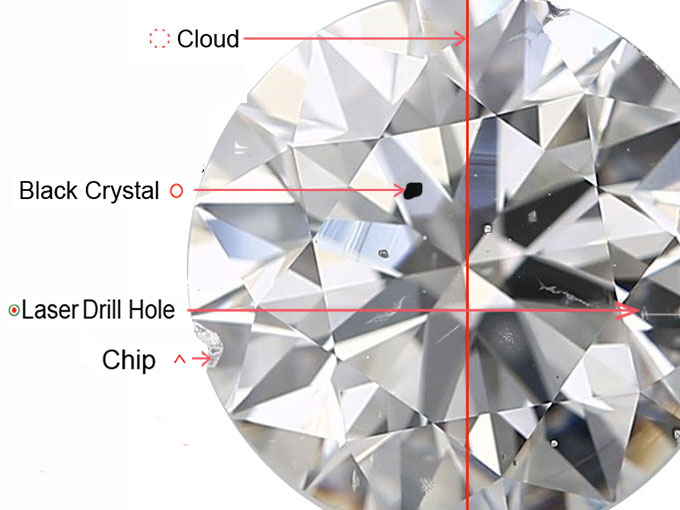 Il diamante sudafricano di seguito ha praticamente tutti i tipi di inclusioni e macchie all’interno di una singola pietra.ย I due difetti naturali di cui preoccuparsi sono i grandi cristalli neri nel tavolo e le nuvole che occupano una grande porzione della pietra.